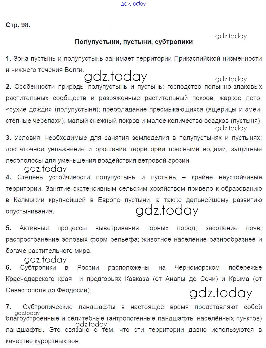 На страницах сайта gdz.today вы найдете учебный и вспомогательный материал, направленный на улучшения знаний школьной программы. ГДЗ - онлайн мир знаний Страницы (решение) 98 Рабочей тетради по Географии для 8 класса Ким, Марченко Дрофа УМК 2016
