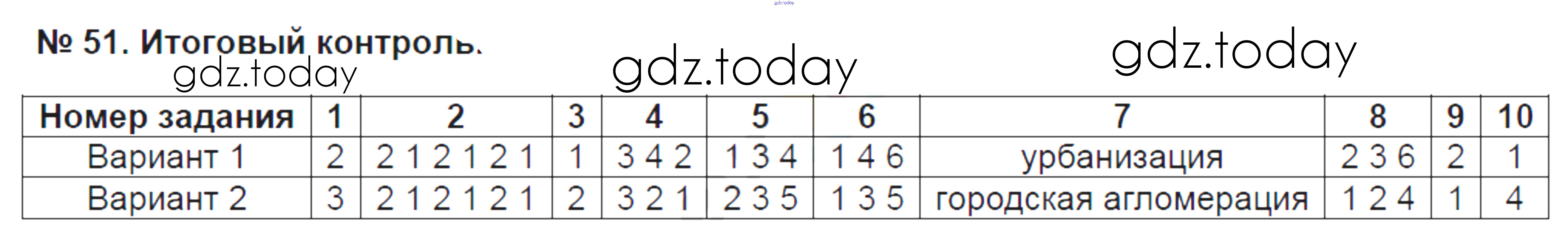 На страницах сайта gdz.today вы найдете учебный и вспомогательный материал, направленный на улучшения знаний школьной программы. ГДЗ - онлайн мир знаний Решение к итоговому контролю 51 Тестам по Географии для 8 класса Пятунина Экзамен УМК 2017