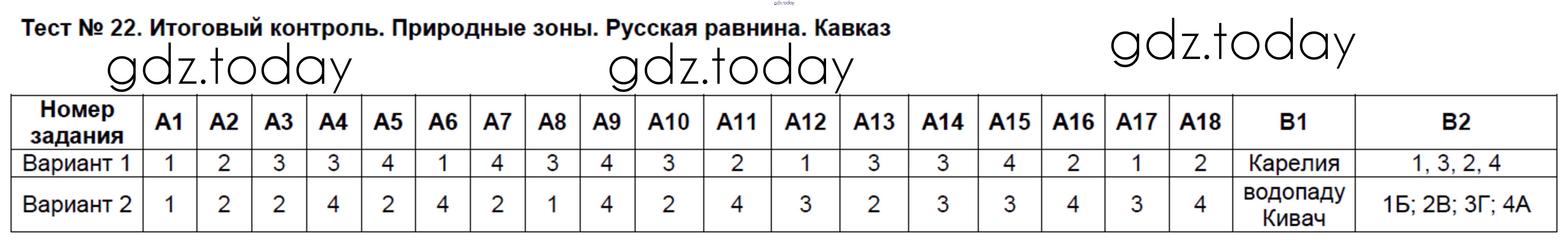 На страницах сайта gdz.today вы найдете учебный и вспомогательный материал, направленный на улучшения знаний школьной программы. ГДЗ - онлайн мир знаний Решение к тестам 22 Контрольно-измерительным материалам (КИМ) по Географии для 8 класса Жижина ВАКО 2018