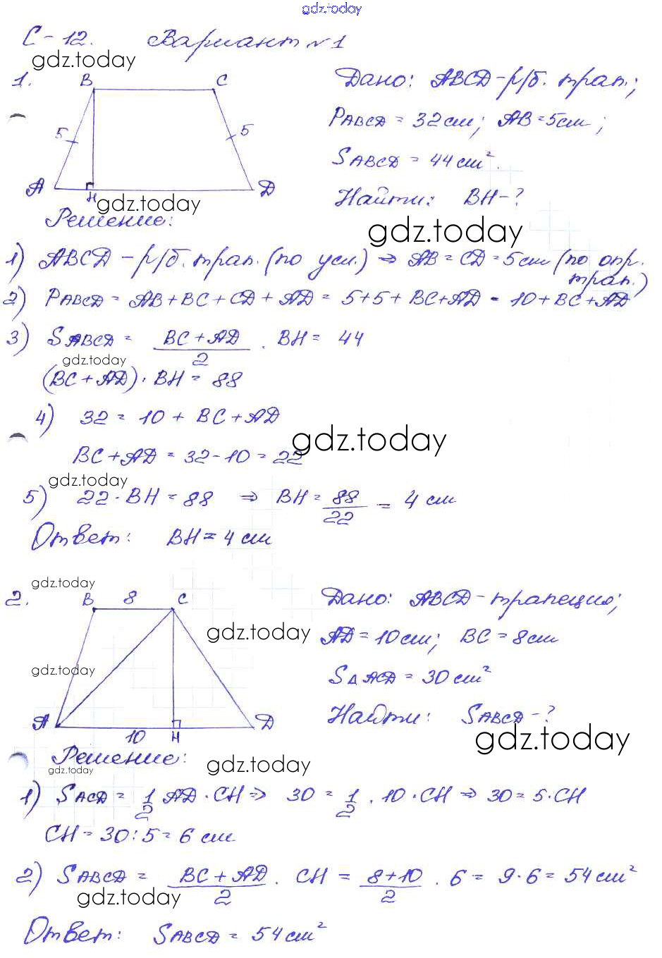 На страницах сайта gdz.today вы найдете учебный и вспомогательный материал, направленный на улучшения знаний школьной программы. ГДЗ - онлайн мир знаний СР №12. Площадь трапеции Решение к самостоятельным работам вариант-1 Дидактическим материалам по Геометрии для 8 класса Зив, Мейлер Просвещение 2016