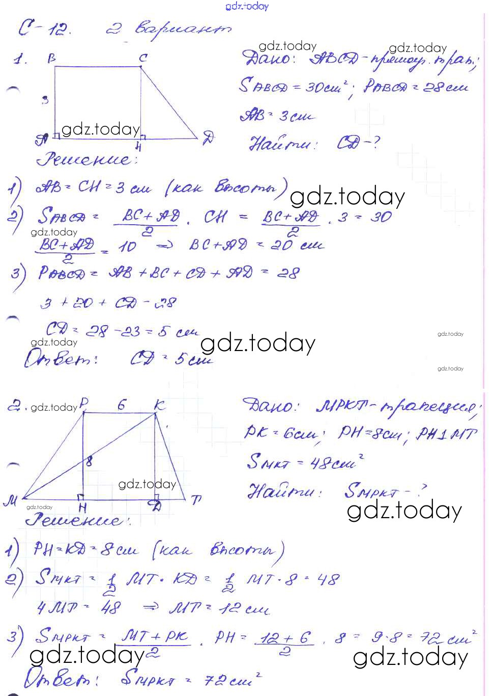 На страницах сайта gdz.today вы найдете учебный и вспомогательный материал, направленный на улучшения знаний школьной программы. ГДЗ - онлайн мир знаний СР №12. Площадь трапеции Решение к самостоятельным работам вариант-2 Дидактическим материалам по Геометрии для 8 класса Зив, Мейлер Просвещение 2016