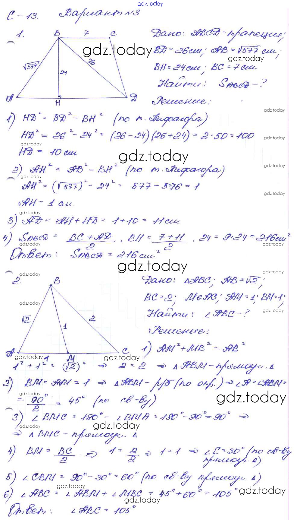 Ответы к СР №13. Теорема Пифагора Решение к самостоятельным работам вариант-3 Дидактическим материалам по Геометрии для 8 класса Зив, Мейлер Просвещение 2016