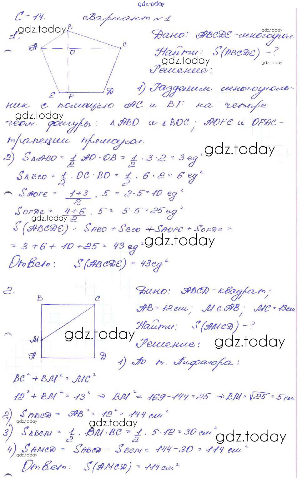 Ответы к СР №14. Площади многоугольников Решение к самостоятельным работам вариант-1 Дидактическим материалам по Геометрии для 8 класса Зив, Мейлер Просвещение 2016