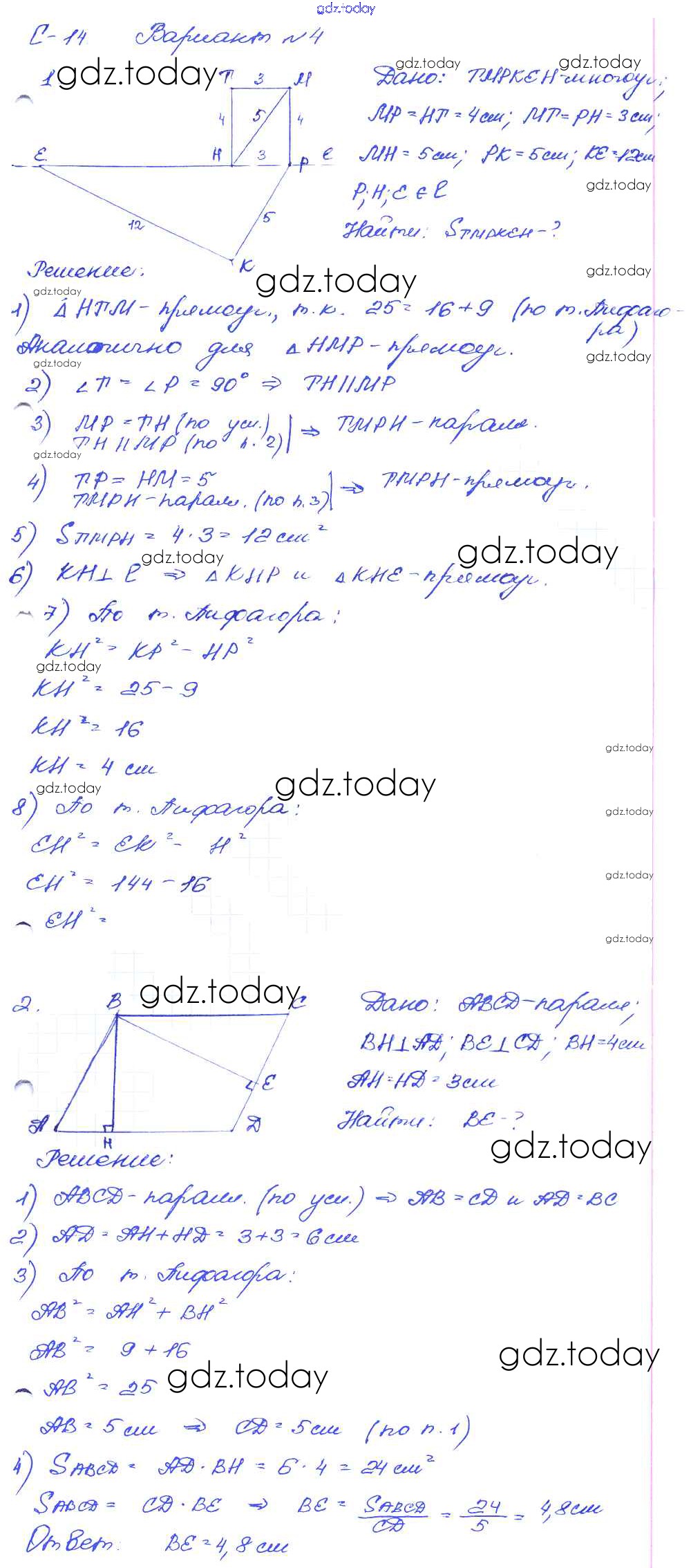 Ответы к СР №14. Площади многоугольников Решение к самостоятельным работам вариант-4 Дидактическим материалам по Геометрии для 8 класса Зив, Мейлер Просвещение 2016