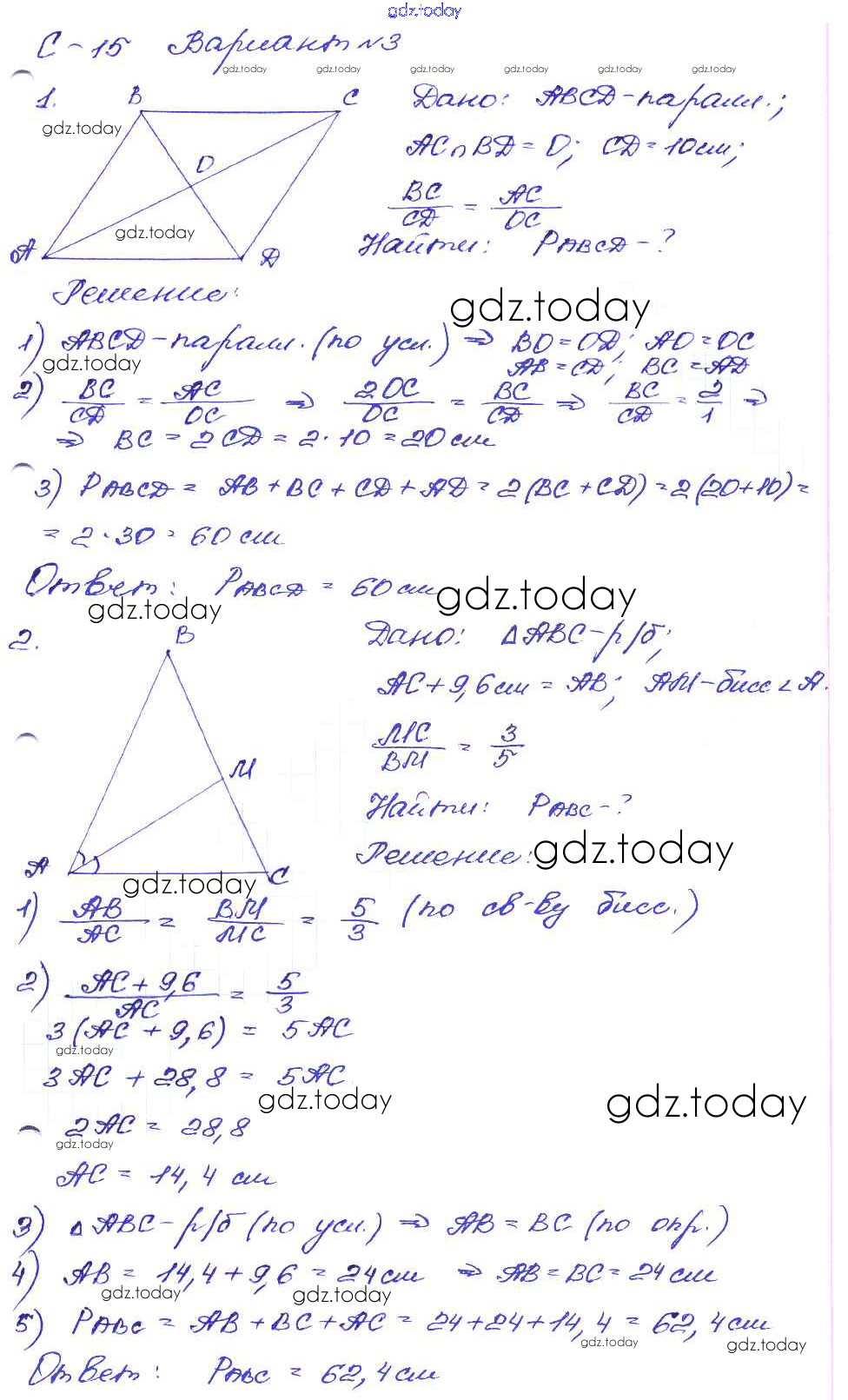 Ответы к СР №15. Пропорциональные отрезки Решение к самостоятельным работам вариант-3 Дидактическим материалам по Геометрии для 8 класса Зив, Мейлер Просвещение 2016
