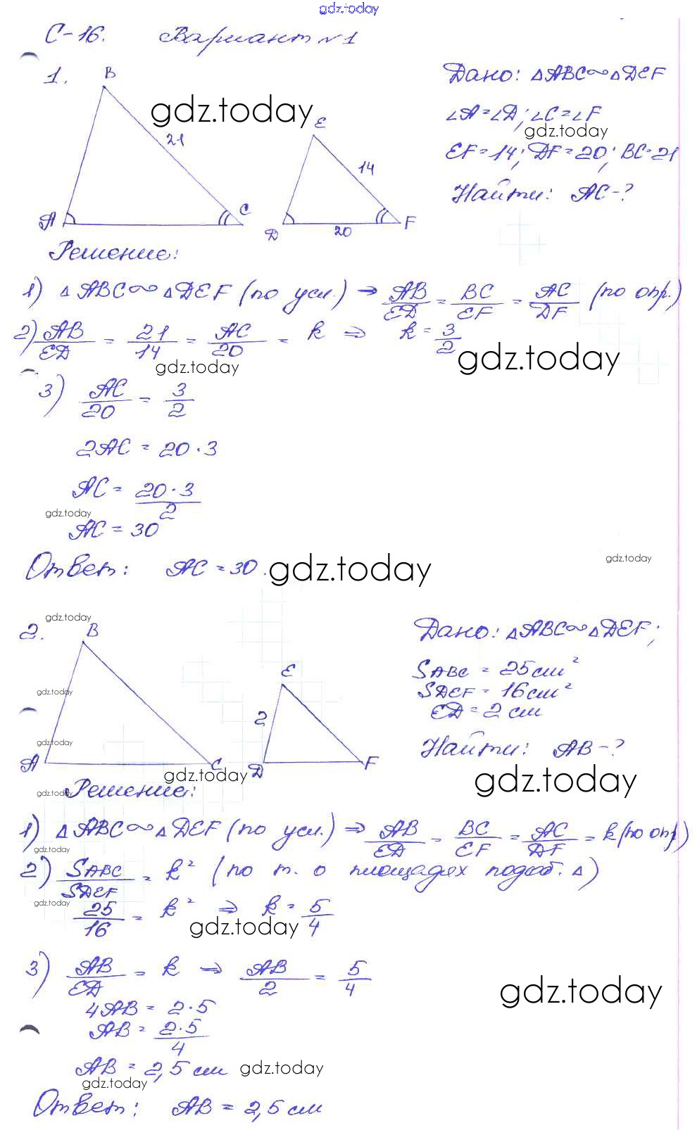 Ответы к СР №16. Определение подобных треугольников Решение к самостоятельным работам вариант-1 Дидактическим материалам по Геометрии для 8 класса Зив, Мейлер Просвещение 2016