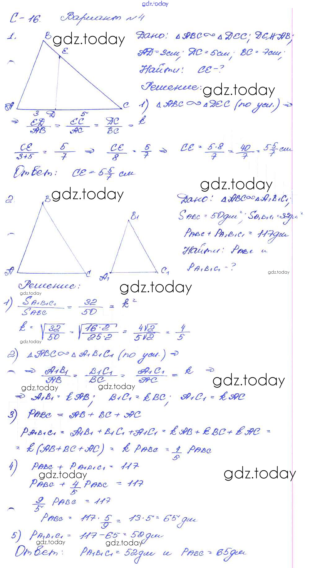 Ответы к СР №16. Определение подобных треугольников Решение к самостоятельным работам вариант-4 Дидактическим материалам по Геометрии для 8 класса Зив, Мейлер Просвещение 2016
