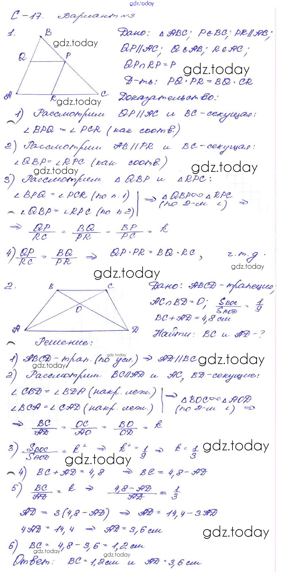 На страницах сайта gdz.today вы найдете учебный и вспомогательный материал, направленный на улучшения знаний школьной программы. ГДЗ - онлайн мир знаний СР №17. Первый признак подобия треугольников Решение к самостоятельным работам вариант-3 Дидактическим материалам по Геометрии для 8 класса Зив, Мейлер Просвещение 2016
