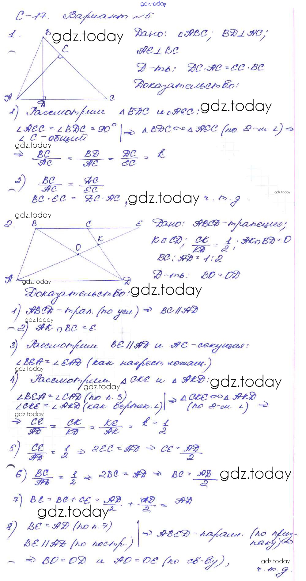 Ответы к СР №17. Первый признак подобия треугольников Решение к самостоятельным работам вариант-5 Дидактическим материалам по Геометрии для 8 класса Зив, Мейлер Просвещение 2016