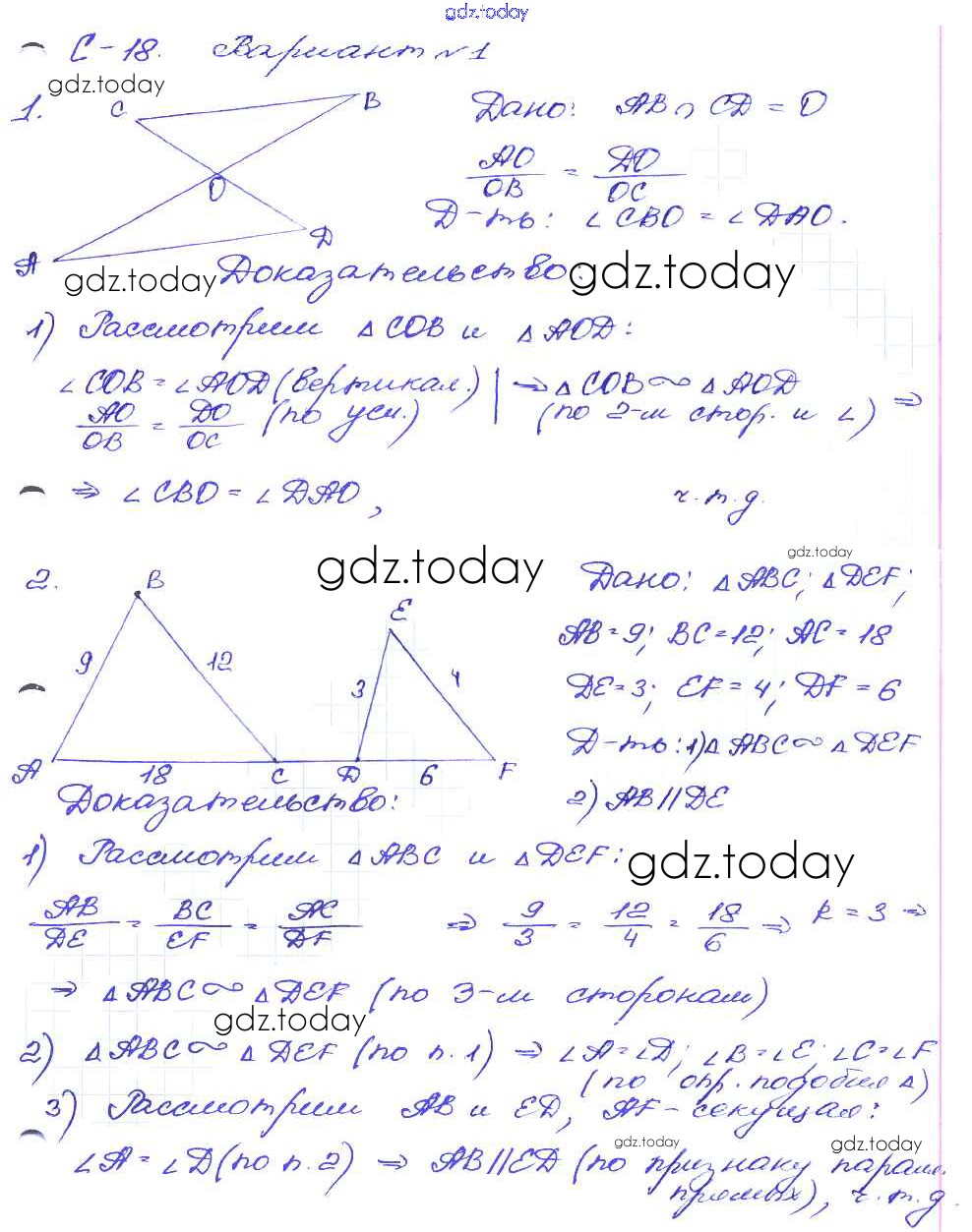На страницах сайта gdz.today вы найдете учебный и вспомогательный материал, направленный на улучшения знаний школьной программы. ГДЗ - онлайн мир знаний СР №18. Второй и третий признак подобия треугольников Решение к самостоятельным работам вариант-1 Дидактическим материалам по Геометрии для 8 класса Зив, Мейлер Просвещение 2016