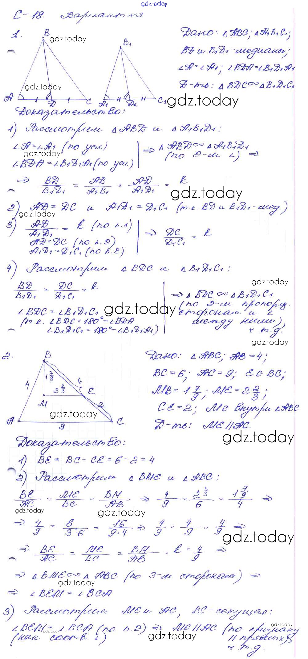 На страницах сайта gdz.today вы найдете учебный и вспомогательный материал, направленный на улучшения знаний школьной программы. ГДЗ - онлайн мир знаний СР №18. Второй и третий признак подобия треугольников Решение к самостоятельным работам вариант-3 Дидактическим материалам по Геометрии для 8 класса Зив, Мейлер Просвещение 2016
