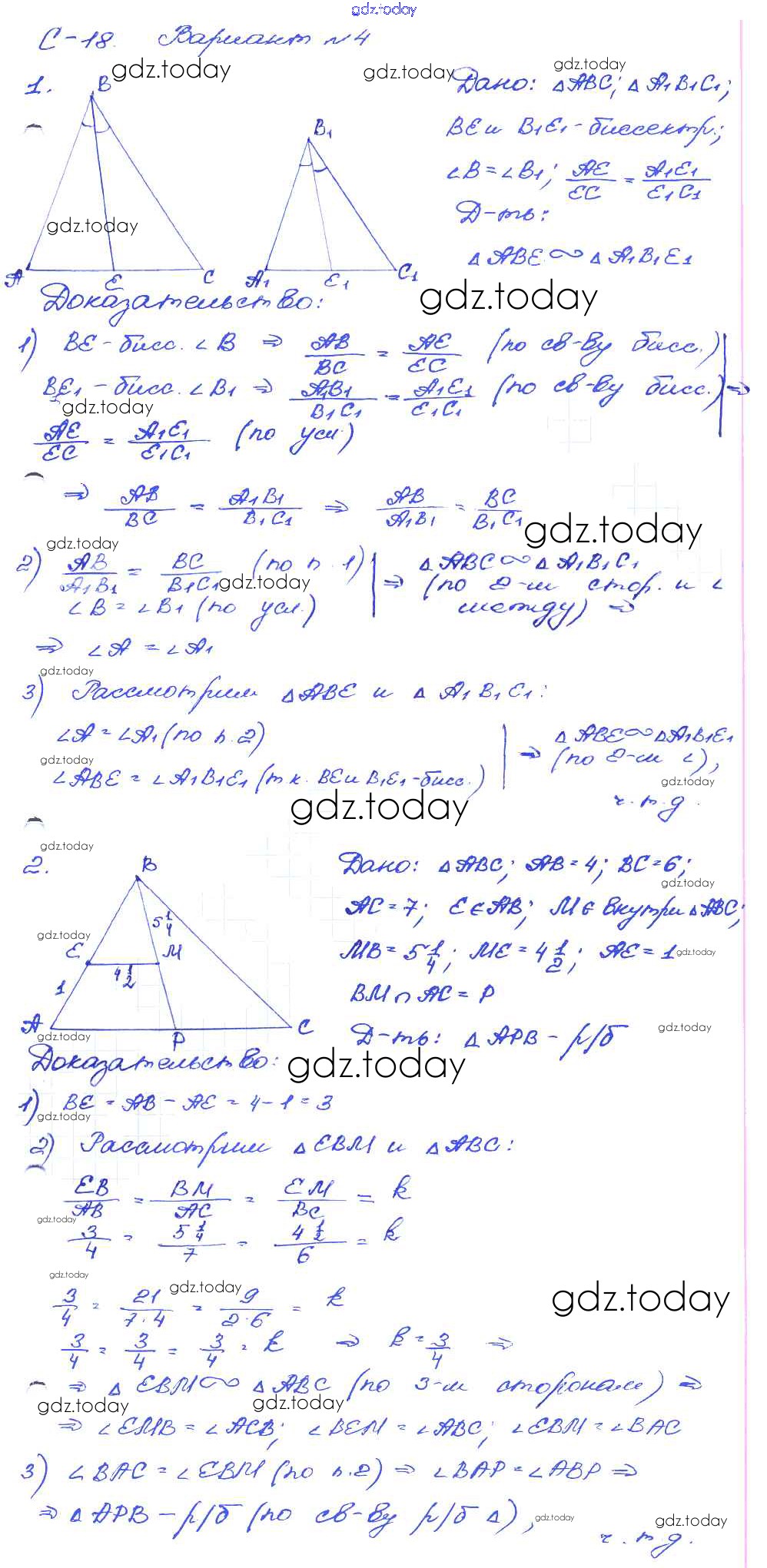 На страницах сайта gdz.today вы найдете учебный и вспомогательный материал, направленный на улучшения знаний школьной программы. ГДЗ - онлайн мир знаний СР №18. Второй и третий признак подобия треугольников Решение к самостоятельным работам вариант-4 Дидактическим материалам по Геометрии для 8 класса Зив, Мейлер Просвещение 2016