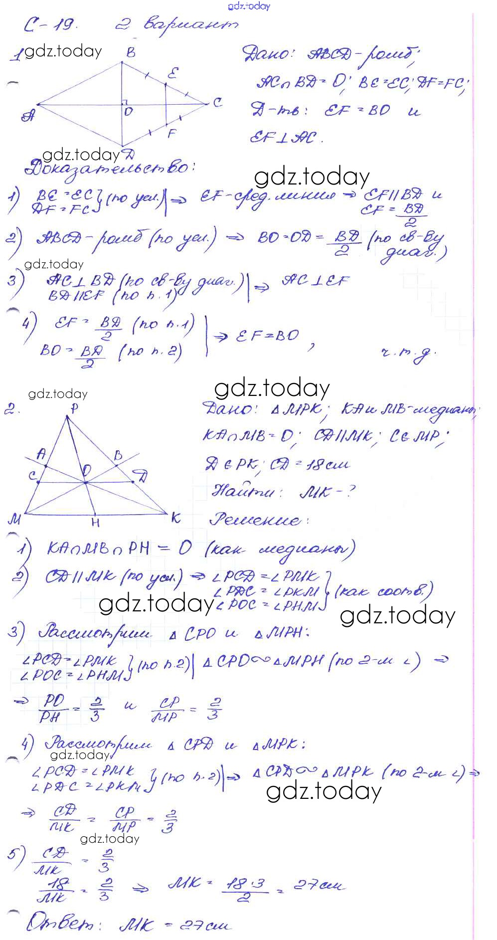 На страницах сайта gdz.today вы найдете учебный и вспомогательный материал, направленный на улучшения знаний школьной программы. ГДЗ - онлайн мир знаний СР №19. Средняя линия треугольника. Свойства медиан Решение к самостоятельным работам вариант-2 Дидактическим материалам по Геометрии для 8 класса Зив, Мейлер Просвещение 2016