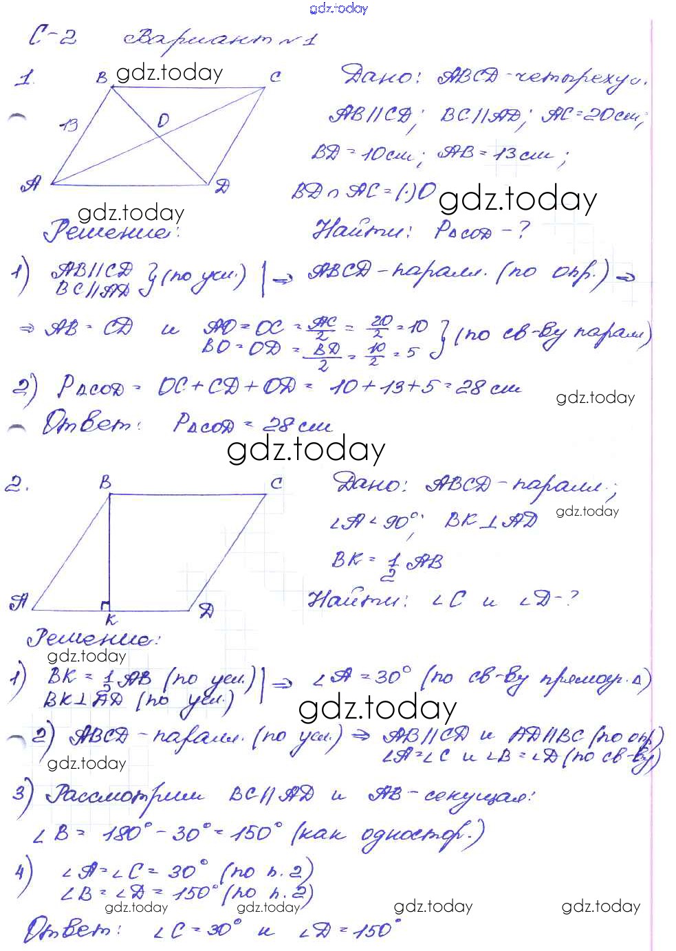 Ответы к СР №2. Параллелограмм и его свойства Решение к самостоятельным работам вариант-1 Дидактическим материалам по Геометрии для 8 класса Зив, Мейлер Просвещение 2016