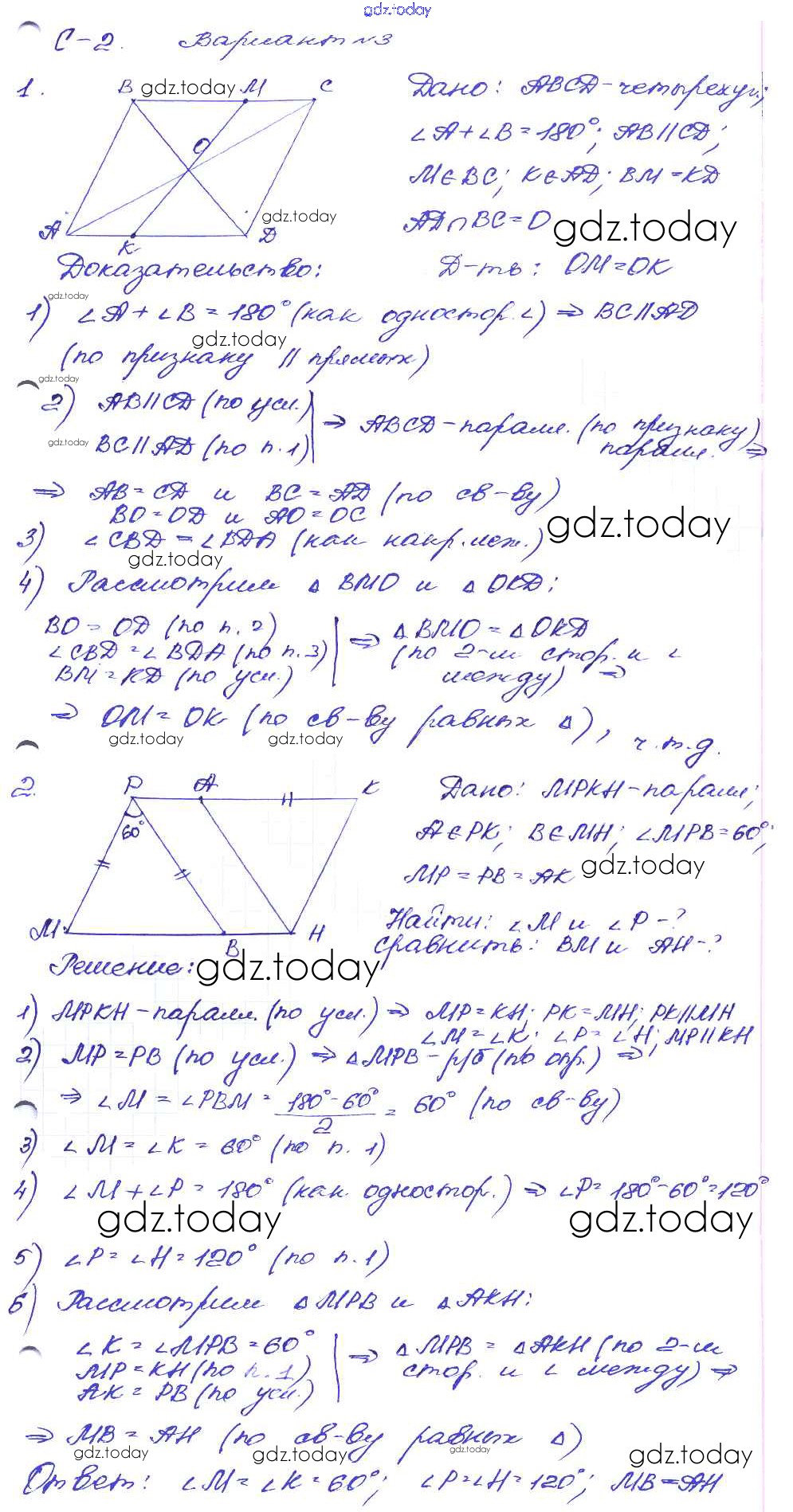 На страницах сайта gdz.today вы найдете учебный и вспомогательный материал, направленный на улучшения знаний школьной программы. ГДЗ - онлайн мир знаний СР №2. Параллелограмм и его свойства Решение к самостоятельным работам вариант-3 Дидактическим материалам по Геометрии для 8 класса Зив, Мейлер Просвещение 2016