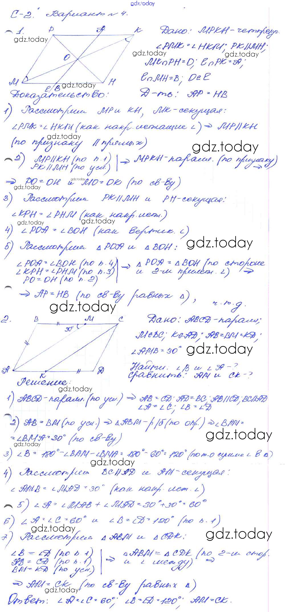 На страницах сайта gdz.today вы найдете учебный и вспомогательный материал, направленный на улучшения знаний школьной программы. ГДЗ - онлайн мир знаний СР №2. Параллелограмм и его свойства Решение к самостоятельным работам вариант-4 Дидактическим материалам по Геометрии для 8 класса Зив, Мейлер Просвещение 2016