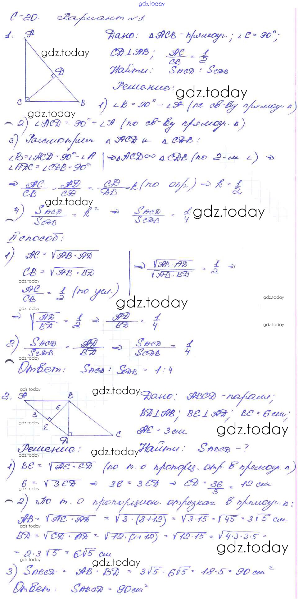 Ответы к СР №20. Пропорциональные отрезки в прямоугольном треугольнике Решение к самостоятельным работам вариант-1 Дидактическим материалам по Геометрии для 8 класса Зив, Мейлер Просвещение 2016