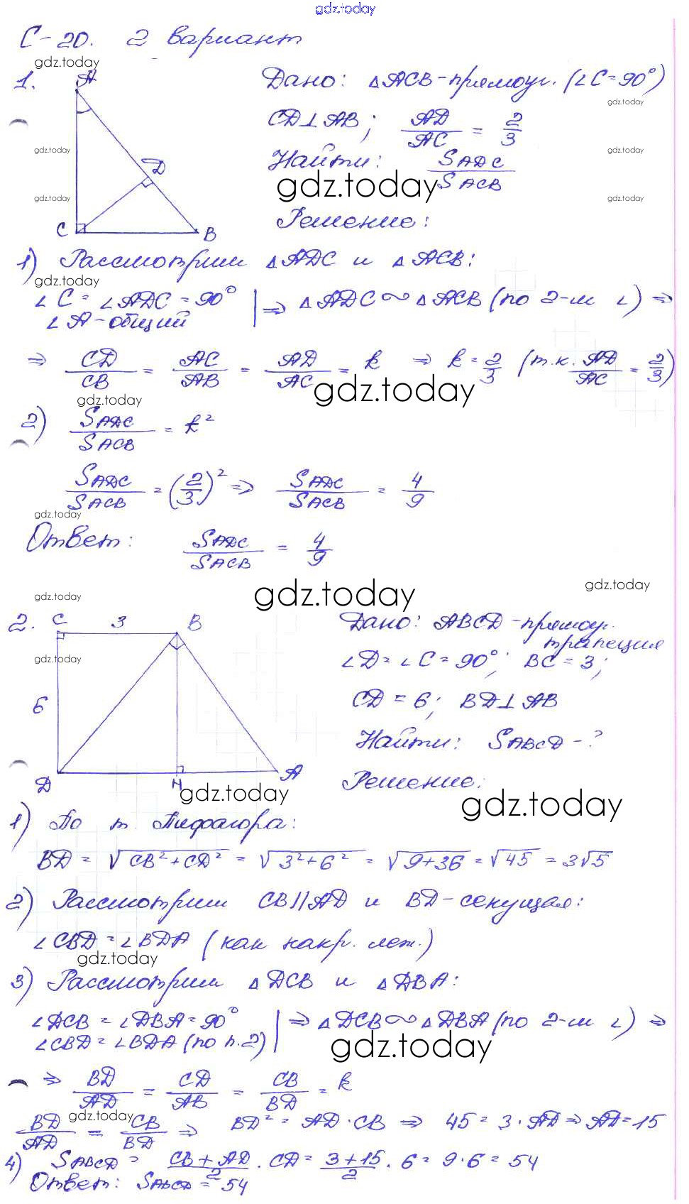 Ответы к СР №20. Пропорциональные отрезки в прямоугольном треугольнике Решение к самостоятельным работам вариант-2 Дидактическим материалам по Геометрии для 8 класса Зив, Мейлер Просвещение 2016