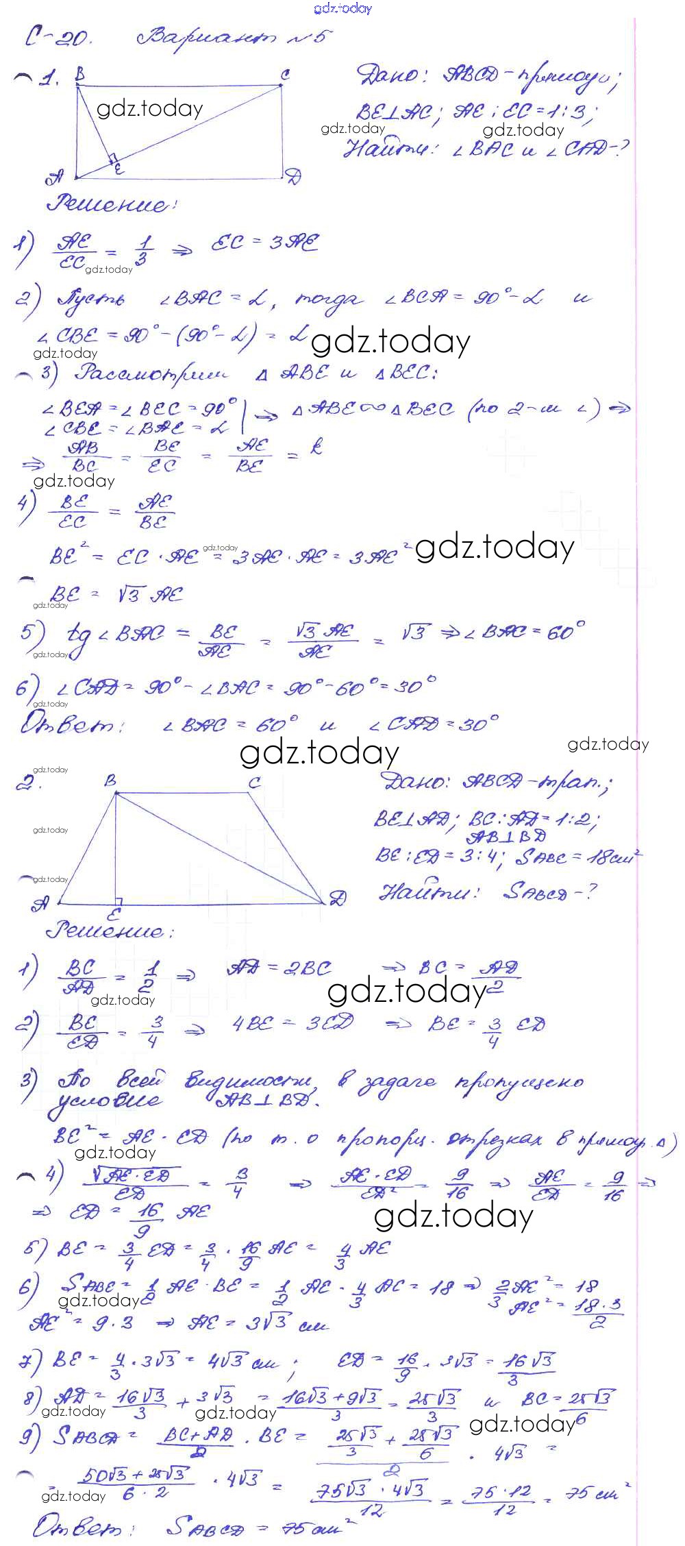 На страницах сайта gdz.today вы найдете учебный и вспомогательный материал, направленный на улучшения знаний школьной программы. ГДЗ - онлайн мир знаний СР №20. Пропорциональные отрезки в прямоугольном треугольнике Решение к самостоятельным работам вариант-5 Дидактическим материалам по Геометрии для 8 класса Зив, Мейлер Просвещение 2016