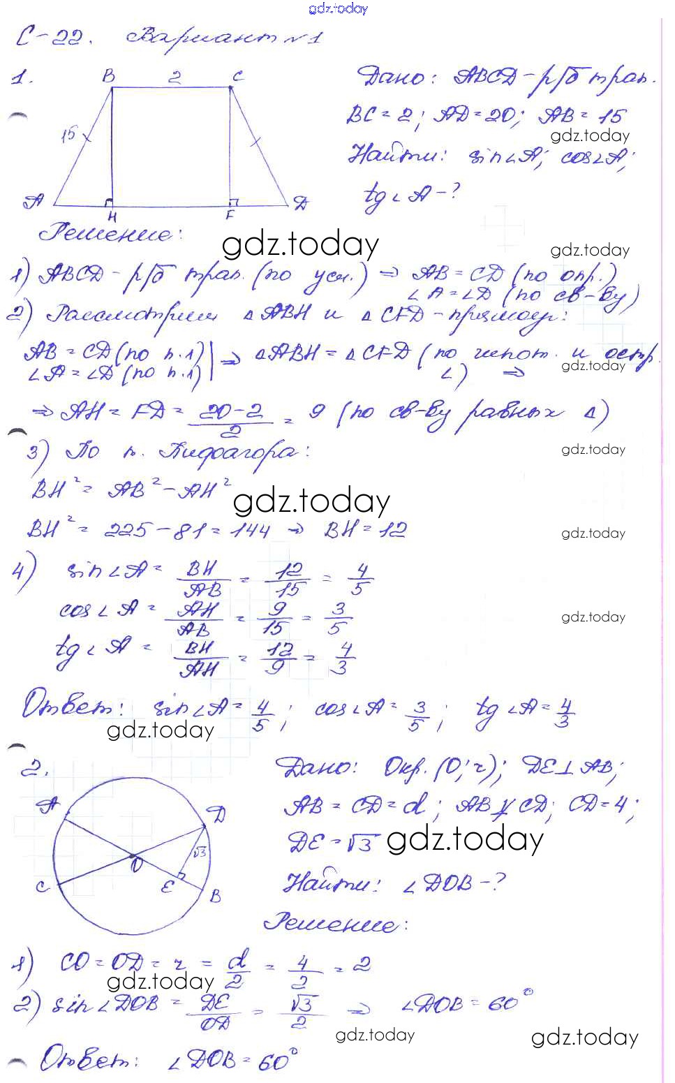На страницах сайта gdz.today вы найдете учебный и вспомогательный материал, направленный на улучшения знаний школьной программы. ГДЗ - онлайн мир знаний СР №22. Синус, косинус и тангенс острого угла треугольника Решение к самостоятельным работам вариант-1 Дидактическим материалам по Геометрии для 8 класса Зив, Мейлер Просвещение 2016