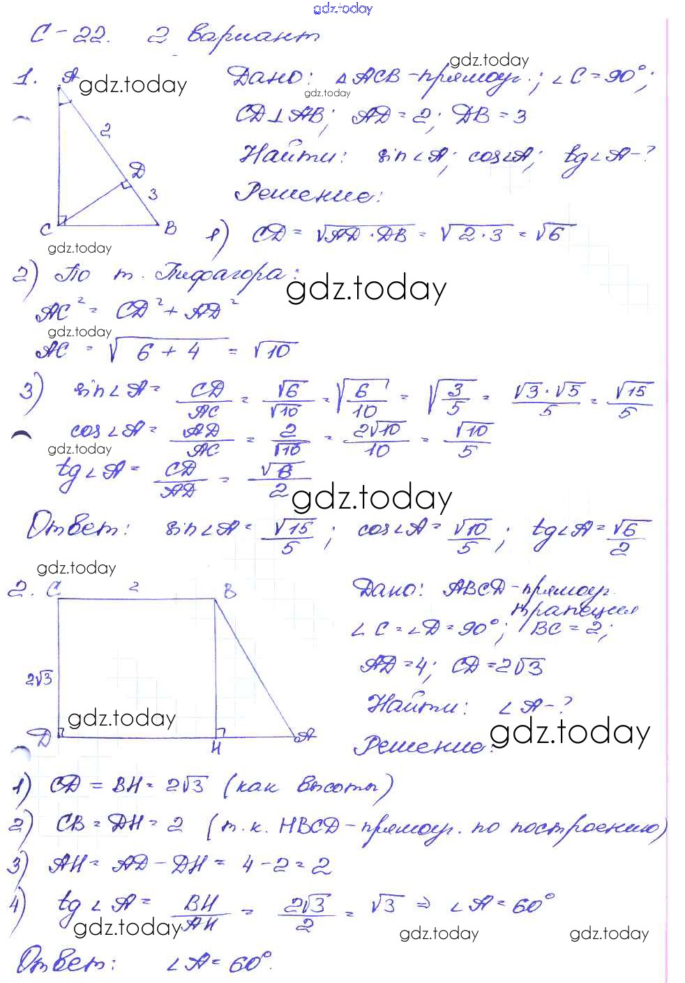 На страницах сайта gdz.today вы найдете учебный и вспомогательный материал, направленный на улучшения знаний школьной программы. ГДЗ - онлайн мир знаний СР №22. Синус, косинус и тангенс острого угла треугольника Решение к самостоятельным работам вариант-2 Дидактическим материалам по Геометрии для 8 класса Зив, Мейлер Просвещение 2016