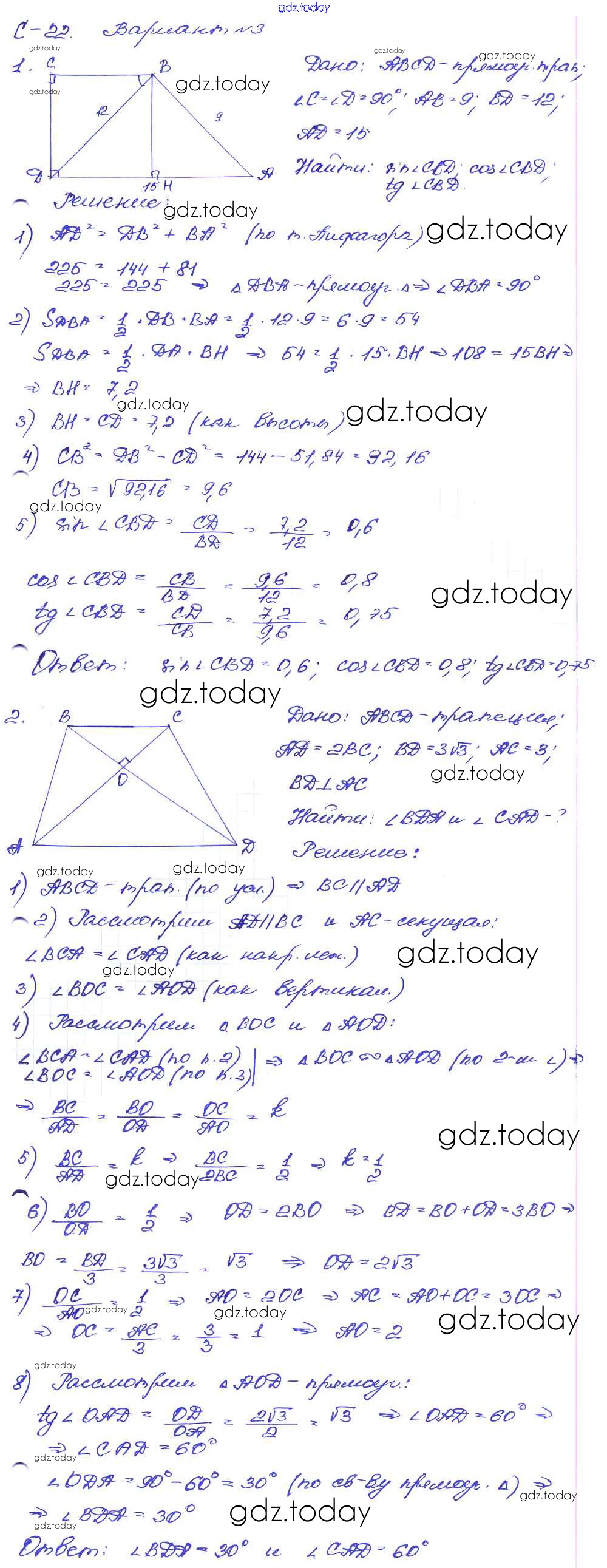 Ответы к СР №22. Синус, косинус и тангенс острого угла треугольника Решение к самостоятельным работам вариант-3 Дидактическим материалам по Геометрии для 8 класса Зив, Мейлер Просвещение 2016