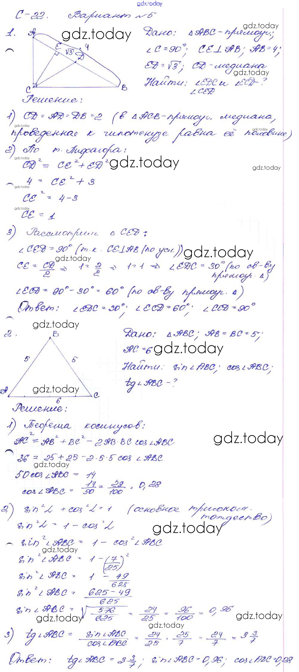 Ответы к СР №22. Синус, косинус и тангенс острого угла треугольника Решение к самостоятельным работам вариант-5 Дидактическим материалам по Геометрии для 8 класса Зив, Мейлер Просвещение 2016