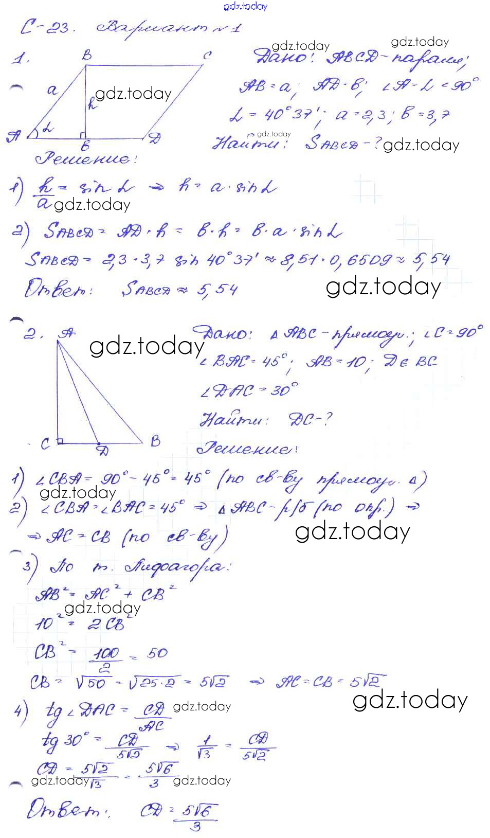 Ответы к СР №23. Решение прямоугольных треугольников Решение к самостоятельным работам вариант-1 Дидактическим материалам по Геометрии для 8 класса Зив, Мейлер Просвещение 2016