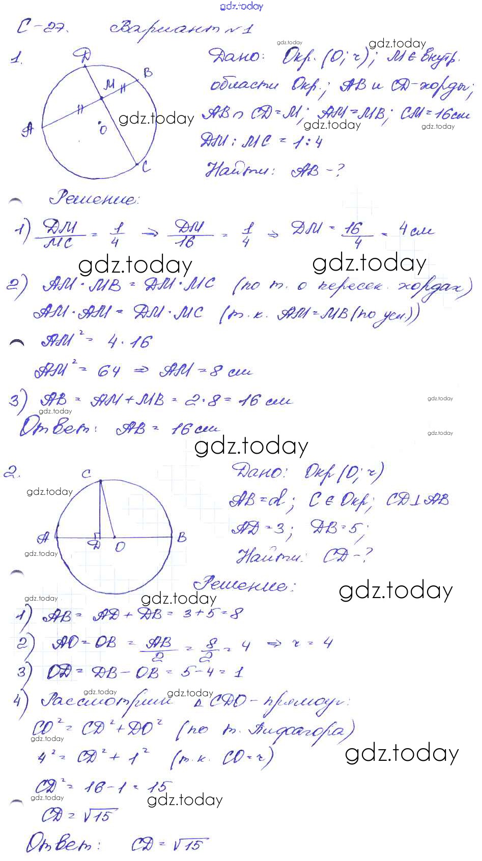 Ответы к СР №27. Теорема о произведении отрезков хорд Решение к самостоятельным работам вариант-1 Дидактическим материалам по Геометрии для 8 класса Зив, Мейлер Просвещение 2016
