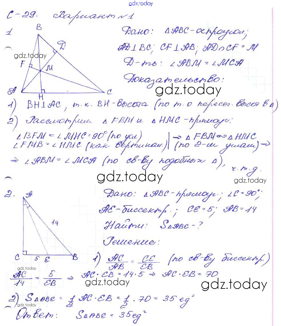 Ответы к СР №29. Четыре замечательные точки треугольника Решение к самостоятельным работам вариант-1 Дидактическим материалам по Геометрии для 8 класса Зив, Мейлер Просвещение 2016