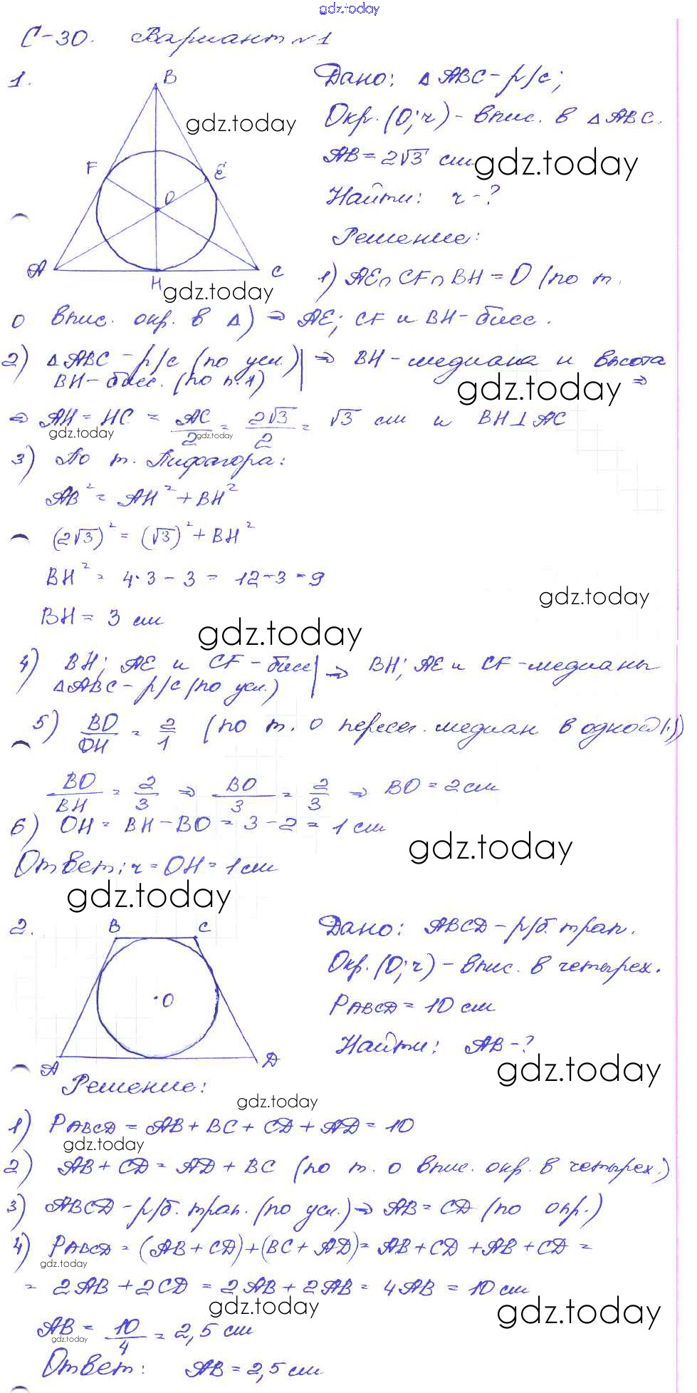 Ответы к СР №30. Вписанная окружность Решение к самостоятельным работам вариант-1 Дидактическим материалам по Геометрии для 8 класса Зив, Мейлер Просвещение 2016