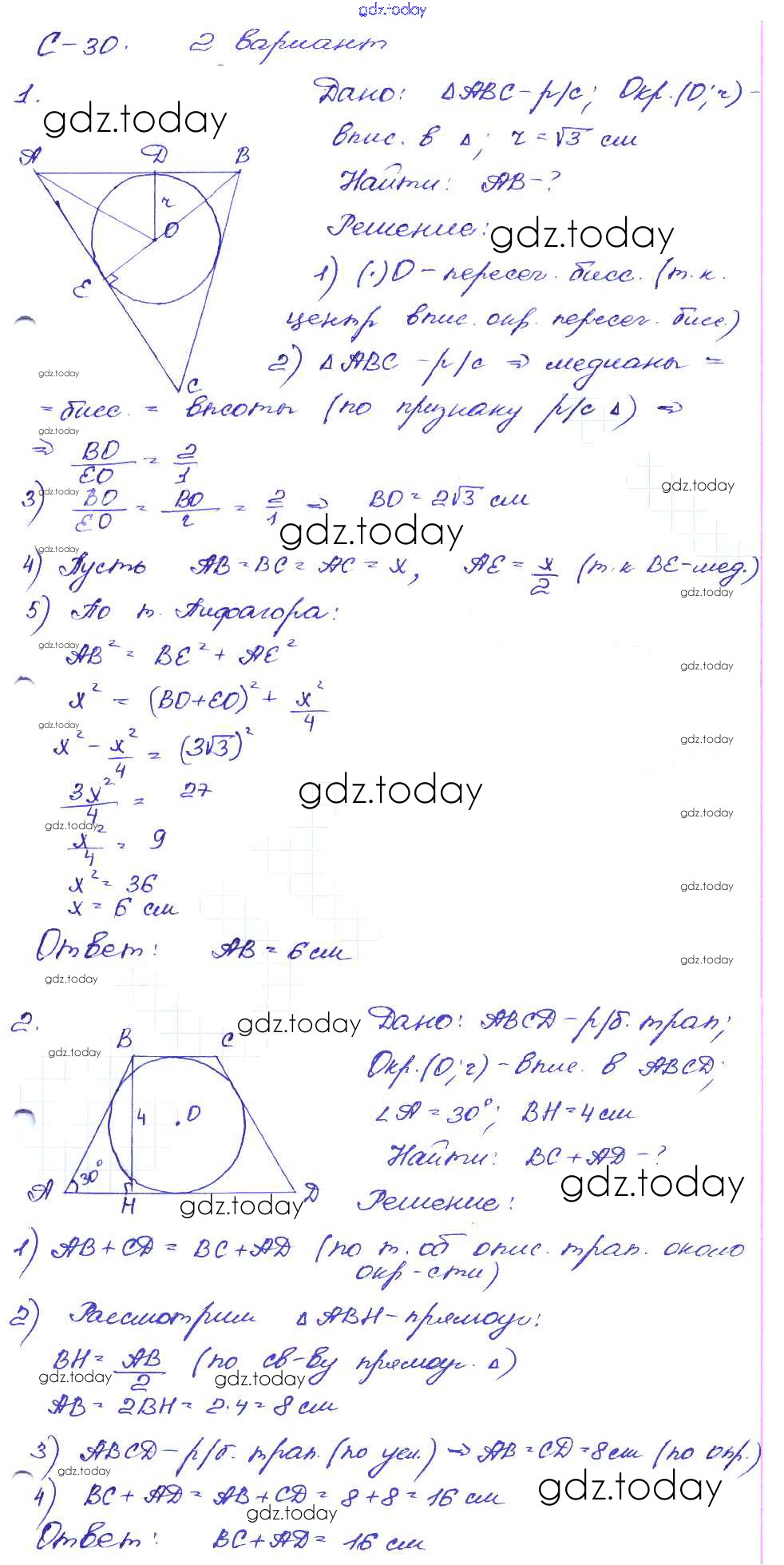 Ответы к СР №30. Вписанная окружность Решение к самостоятельным работам вариант-2 Дидактическим материалам по Геометрии для 8 класса Зив, Мейлер Просвещение 2016