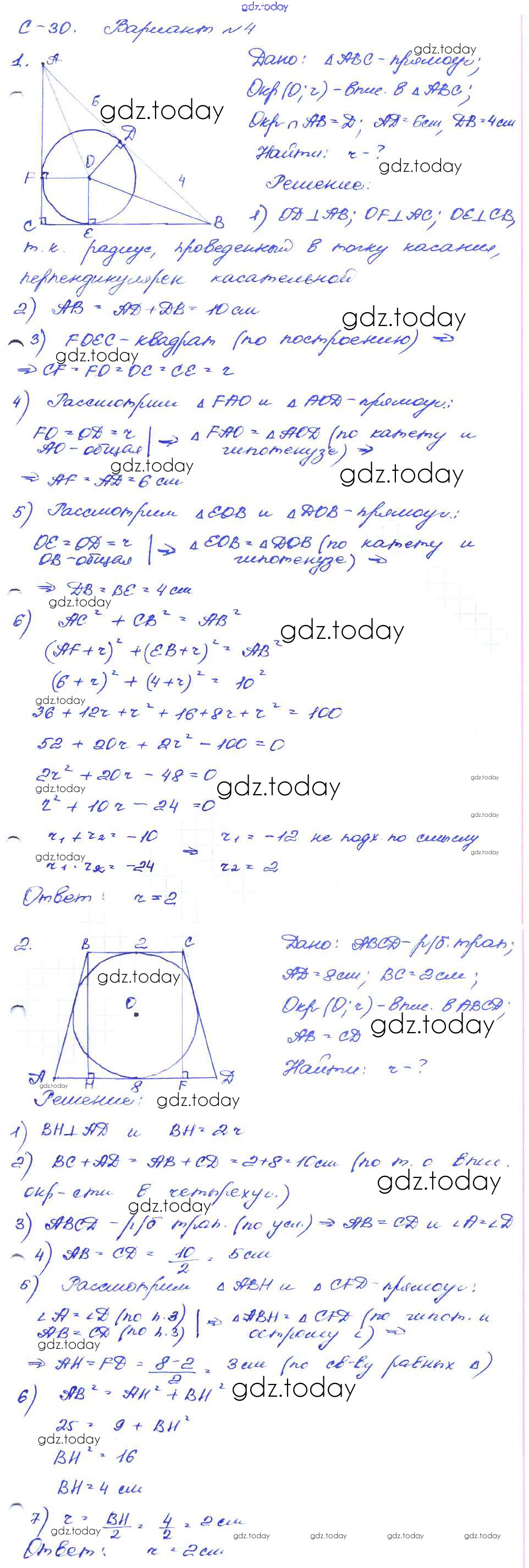 Ответы к СР №30. Вписанная окружность Решение к самостоятельным работам вариант-4 Дидактическим материалам по Геометрии для 8 класса Зив, Мейлер Просвещение 2016