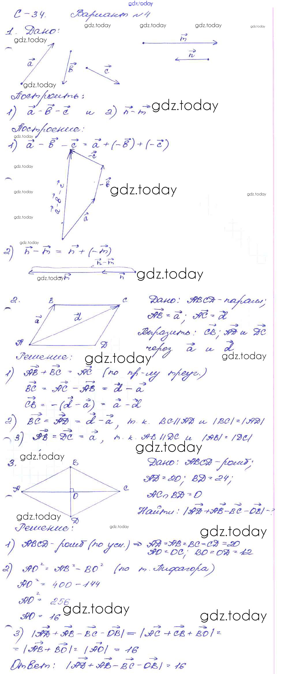 Ответы к СР №34. Вычитание векторов Решение к самостоятельным работам вариант-4 Дидактическим материалам по Геометрии для 8 класса Зив, Мейлер Просвещение 2016
