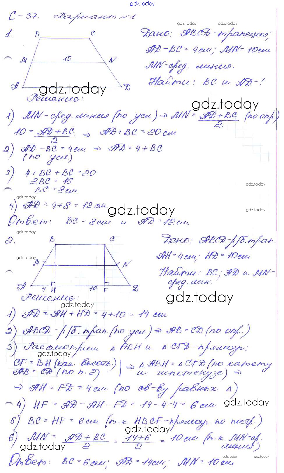 На страницах сайта gdz.today вы найдете учебный и вспомогательный материал, направленный на улучшения знаний школьной программы. ГДЗ - онлайн мир знаний СР №37. Средняя линия трапеции Решение к самостоятельным работам вариант-1 Дидактическим материалам по Геометрии для 8 класса Зив, Мейлер Просвещение 2016