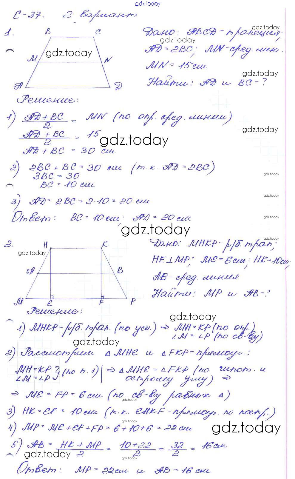 На страницах сайта gdz.today вы найдете учебный и вспомогательный материал, направленный на улучшения знаний школьной программы. ГДЗ - онлайн мир знаний СР №37. Средняя линия трапеции Решение к самостоятельным работам вариант-2 Дидактическим материалам по Геометрии для 8 класса Зив, Мейлер Просвещение 2016