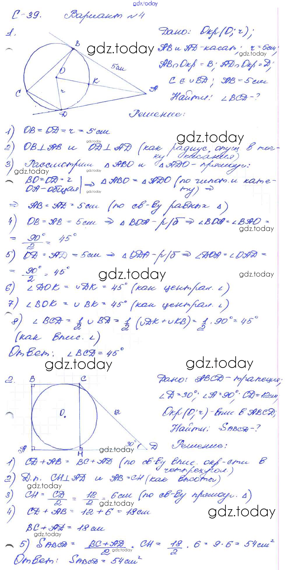Ответы к СР №39. Итоговое повторение (окружность) Решение к самостоятельным работам вариант-4 Дидактическим материалам по Геометрии для 8 класса Зив, Мейлер Просвещение 2016