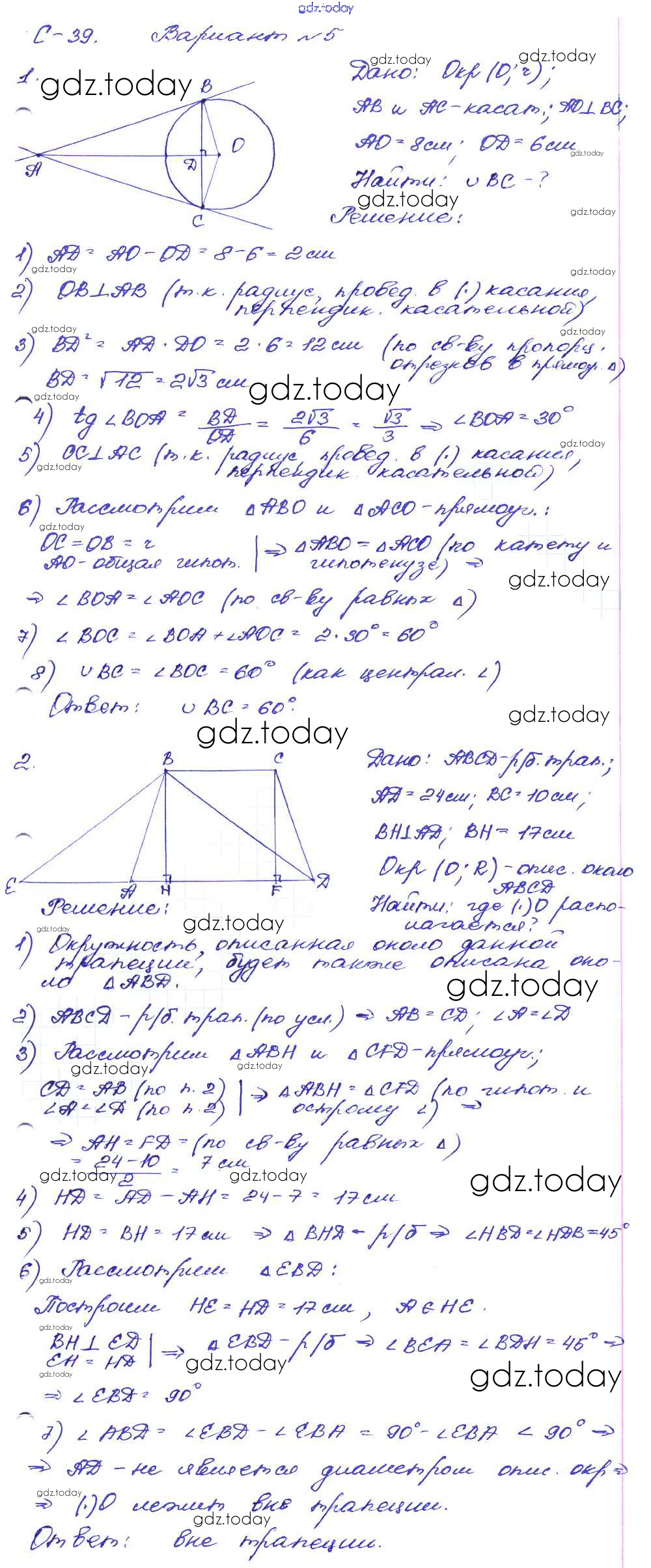 Ответы к СР №39. Итоговое повторение (окружность) Решение к самостоятельным работам вариант-5 Дидактическим материалам по Геометрии для 8 класса Зив, Мейлер Просвещение 2016