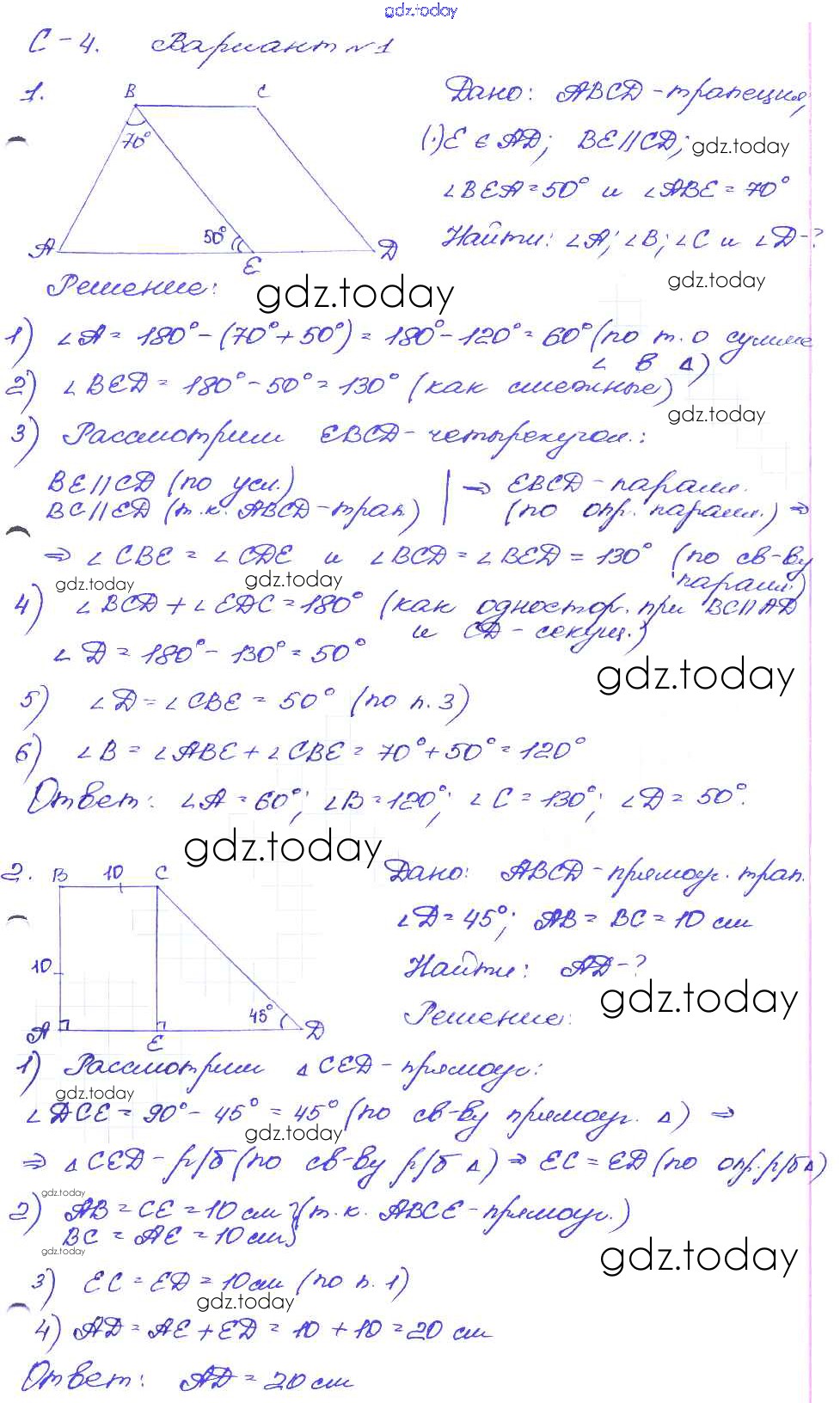 На страницах сайта gdz.today вы найдете учебный и вспомогательный материал, направленный на улучшения знаний школьной программы. ГДЗ - онлайн мир знаний СР №4. Трапеция Решение к самостоятельным работам вариант-1 Дидактическим материалам по Геометрии для 8 класса Зив, Мейлер Просвещение 2016