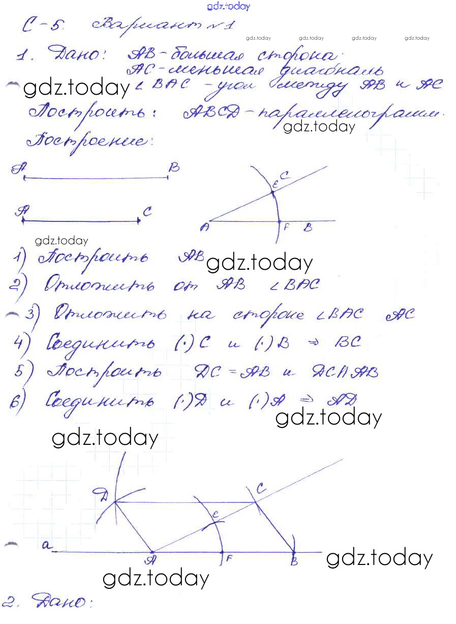 Ответы к СР №5. Задачи на построение параллелограмма и трапеции Решение к самостоятельным работам вариант-1 Дидактическим материалам по Геометрии для 8 класса Зив, Мейлер Просвещение 2016