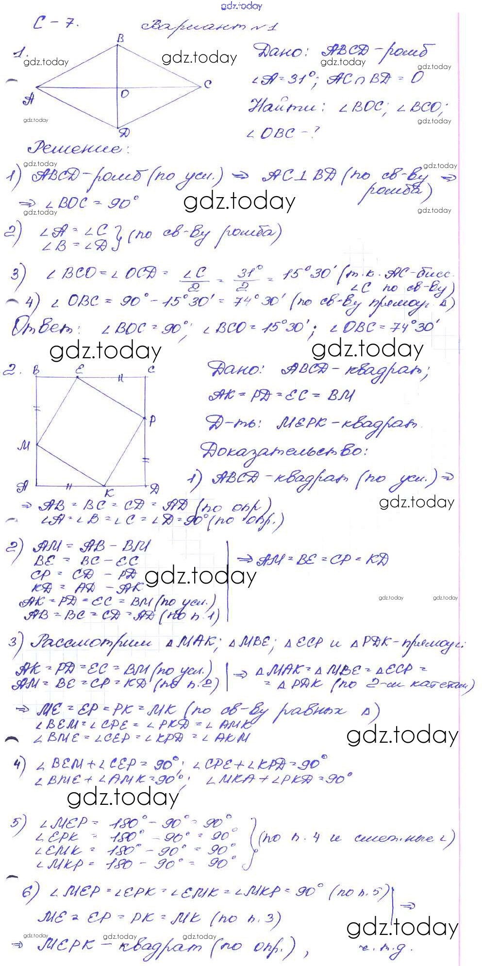 На страницах сайта gdz.today вы найдете учебный и вспомогательный материал, направленный на улучшения знаний школьной программы. ГДЗ - онлайн мир знаний СР №7. Ромб и квадрат Решение к самостоятельным работам вариант-1 Дидактическим материалам по Геометрии для 8 класса Зив, Мейлер Просвещение 2016