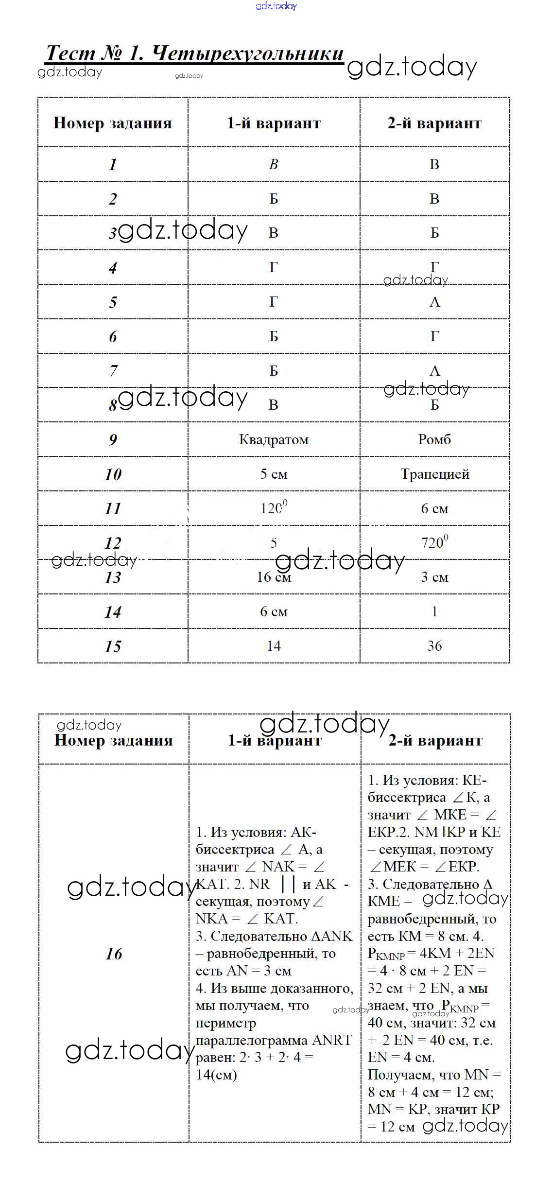 Ответы к Решение к тесту 1. Четырехугольники Вариант 1 и 2 Тестам по Геометрии для 8 класса Фарков Экзамен УМК 2014