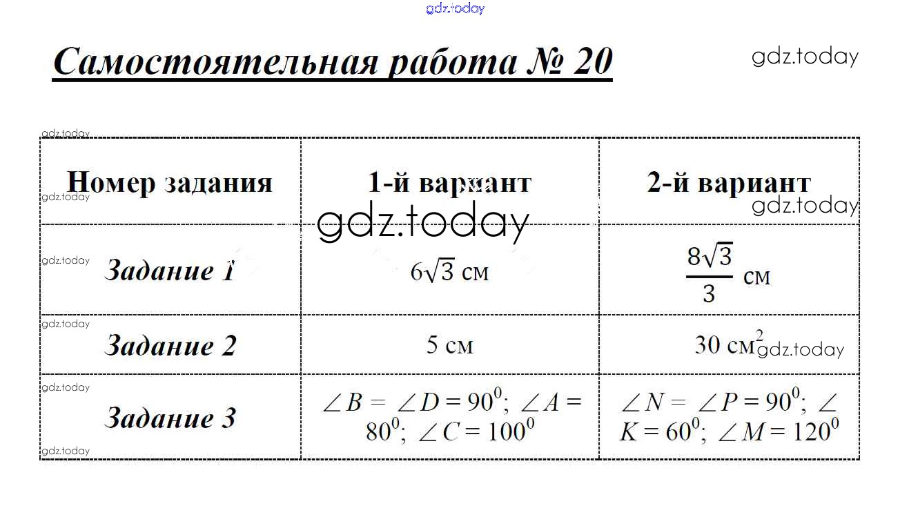 На страницах сайта gdz.today вы найдете учебный и вспомогательный материал, направленный на улучшения знаний школьной программы. ГДЗ - онлайн мир знаний Решение к самостоятельным работам 20 Контрольно-измерительным материалам (КИМ) по Геометрии для 8 класса Гаврилова ВАКО 2018