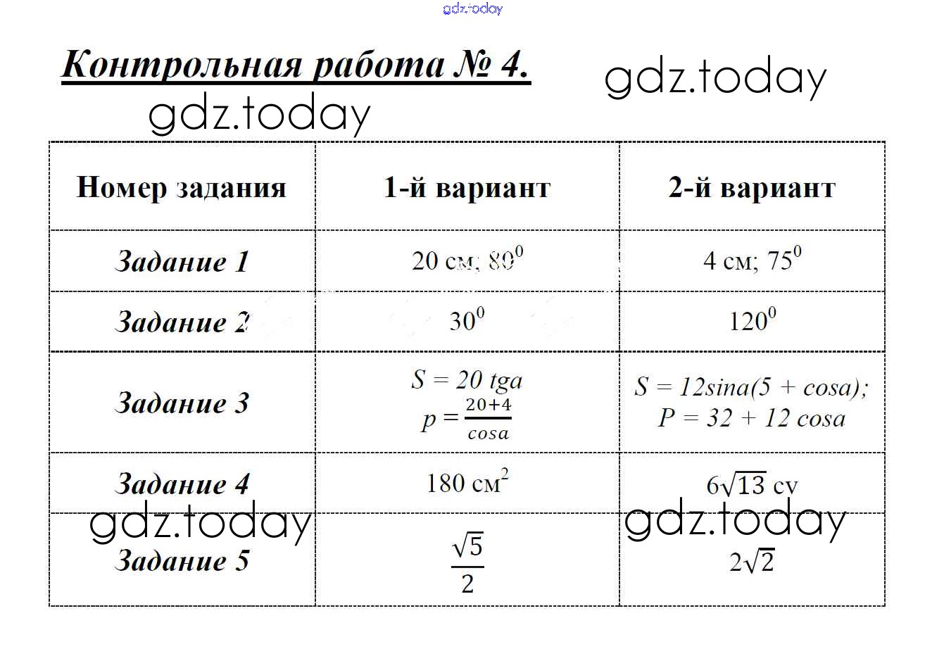 На страницах сайта gdz.today вы найдете учебный и вспомогательный материал, направленный на улучшения знаний школьной программы. ГДЗ - онлайн мир знаний Решение к контрольным работам 4 Контрольно-измерительным материалам (КИМ) по Геометрии для 8 класса Гаврилова ВАКО 2018