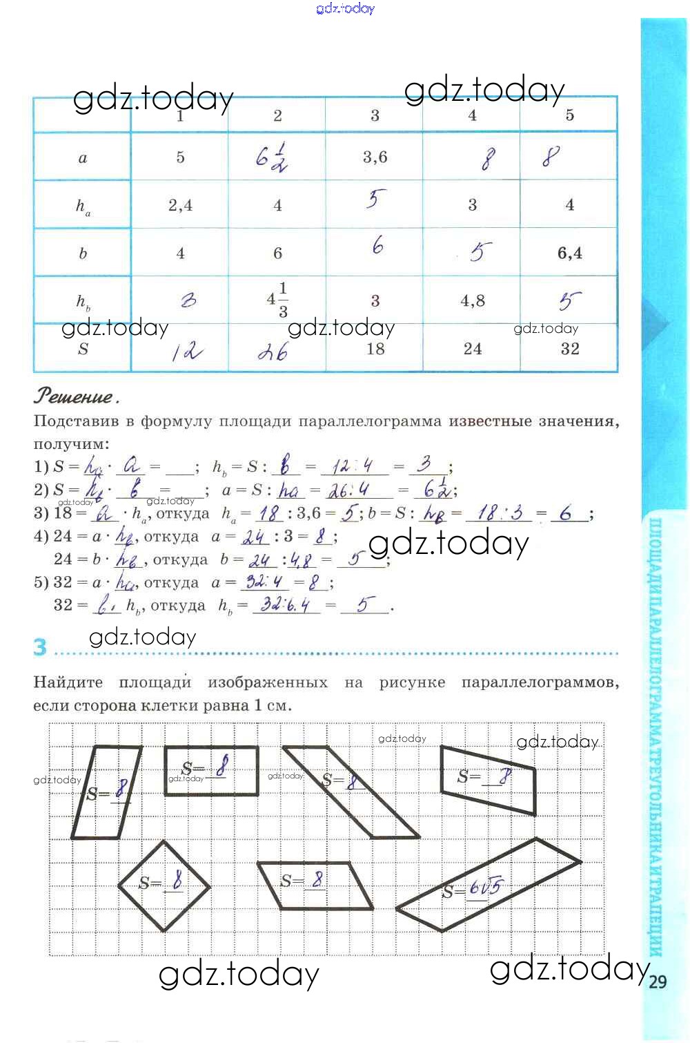 Ответы к Решение к главе VI. Площадь стр. 29 Рабочей тетради по Геометрии для 8 класса Глазков, Камаев Экзамен УМК 2017