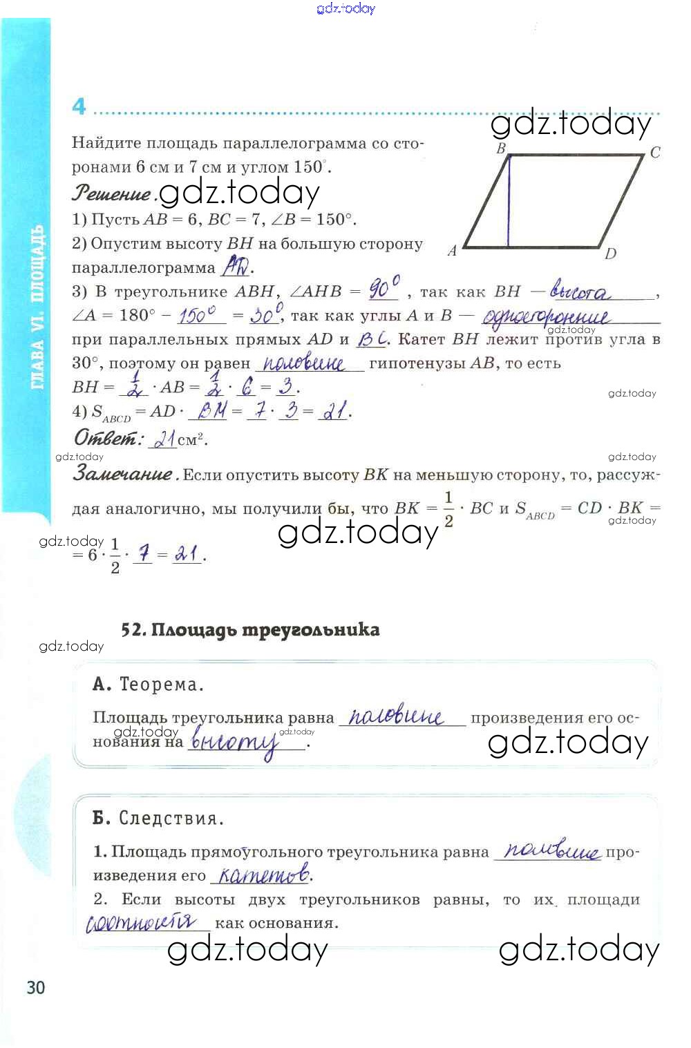Ответы к Решение к главе VI. Площадь стр. 30 Рабочей тетради по Геометрии для 8 класса Глазков, Камаев Экзамен УМК 2017
