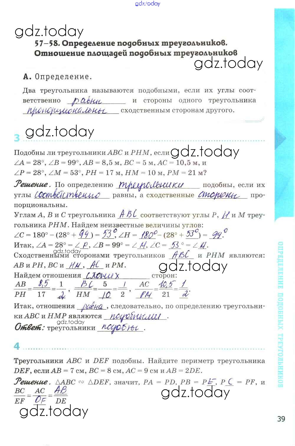 Ответы к Решение к главе VII. Подобные треугольники стр. 39 Рабочей тетради по Геометрии для 8 класса Глазков, Камаев Экзамен УМК 2017