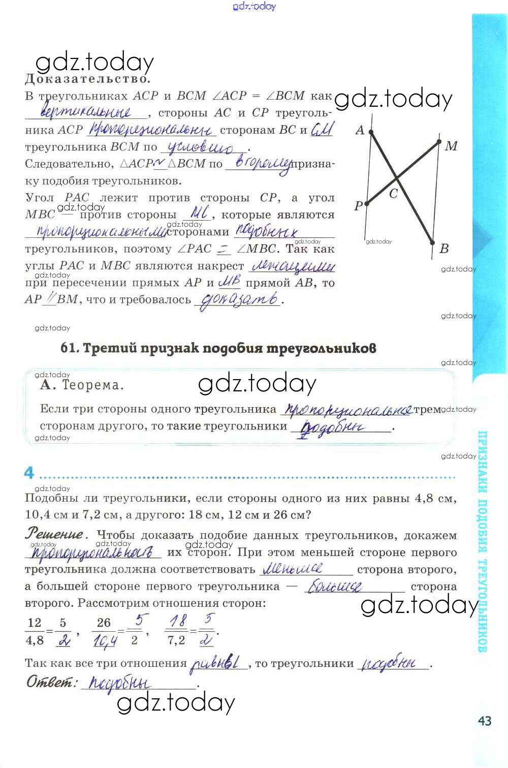 Ответы к Решение к главе VII. Подобные треугольники стр. 43 Рабочей тетради по Геометрии для 8 класса Глазков, Камаев Экзамен УМК 2017