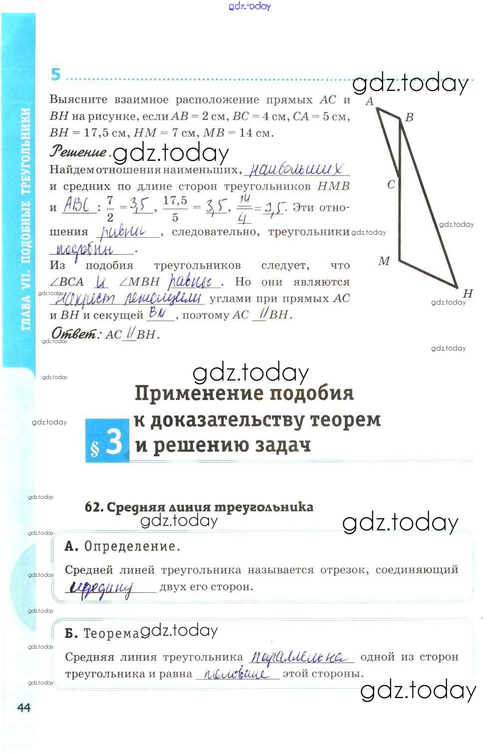 Ответы к Решение к главе VII. Подобные треугольники стр. 44 Рабочей тетради по Геометрии для 8 класса Глазков, Камаев Экзамен УМК 2017