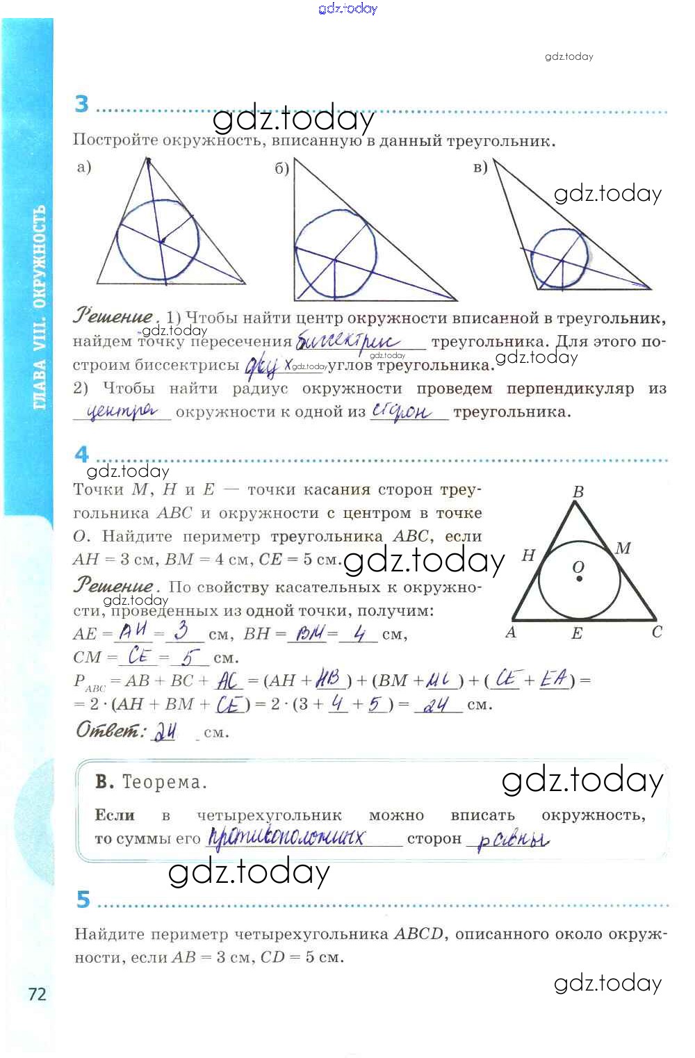 Ответы к Решение к главе VIII. Окружность стр. 72 Рабочей тетради по Геометрии для 8 класса Глазков, Камаев Экзамен УМК 2017